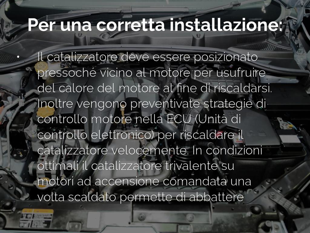 - Il catalizzatore deve essere posizionato pressoché vicino al motore per usufruire del calore del motore al fine di riscaldarsi. Inoltre vengono preventivate strategie di controllo motore nella ECU (Unità di controllo elettronico) per riscaldare il catalizzatore velocemente. In condizioni ottimali il catalizzatore trivalente su motori ad accensione comandata una volta scaldato permette di abbattere quasi tutte le emissioni inquinanti.