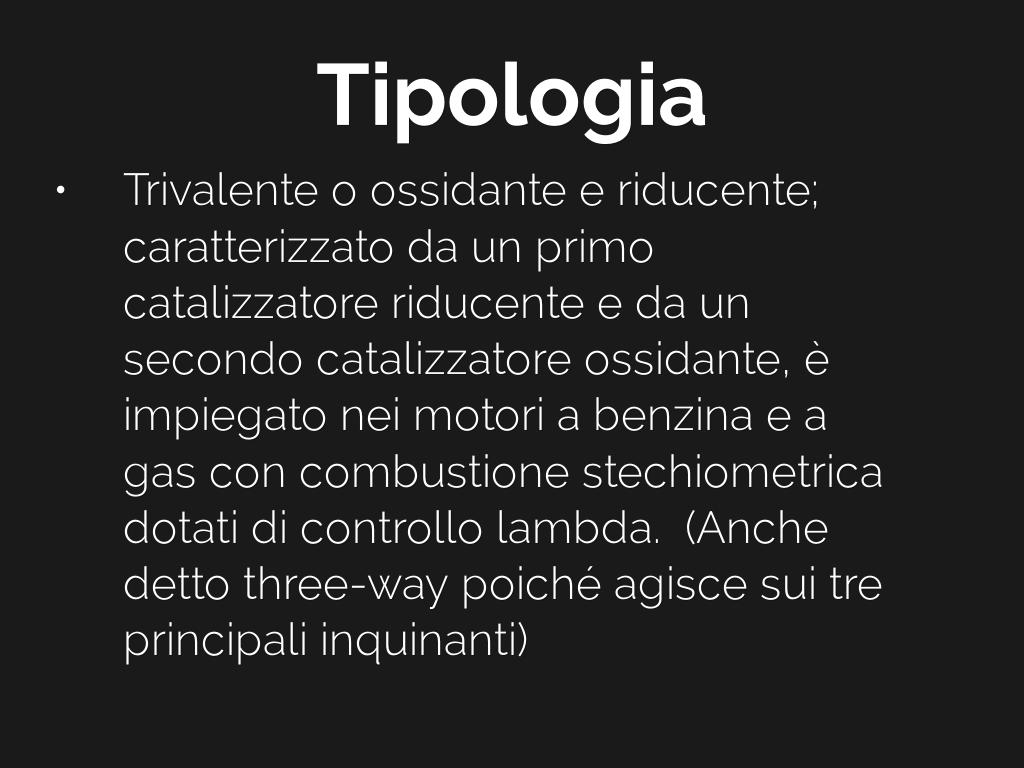 - Trivalente o ossidante e riducente; caratterizzato da un primo catalizzatore riducente e da un secondo catalizzatore ossidante, è impiegato nei motori a benzina e a gas con combustione stechiometrica dotati di controllo lambda. (Anche detto three-way poiché agisce sui tre principali inquinanti)