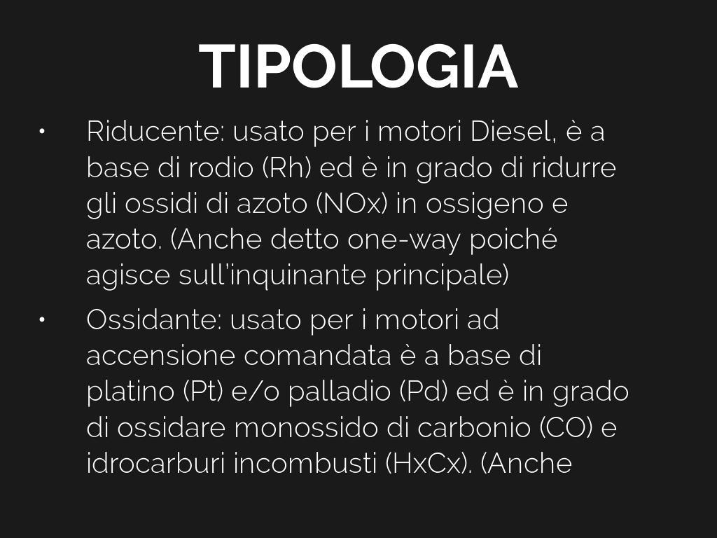 - Riducente: usato per i motori Diesel, è a base di rodio (Rh) ed è in grado di ridurre gli ossidi di azoto (NOx) in ossigeno e azoto. (Anche detto one-way poiché agisce sull’inquinante principale)