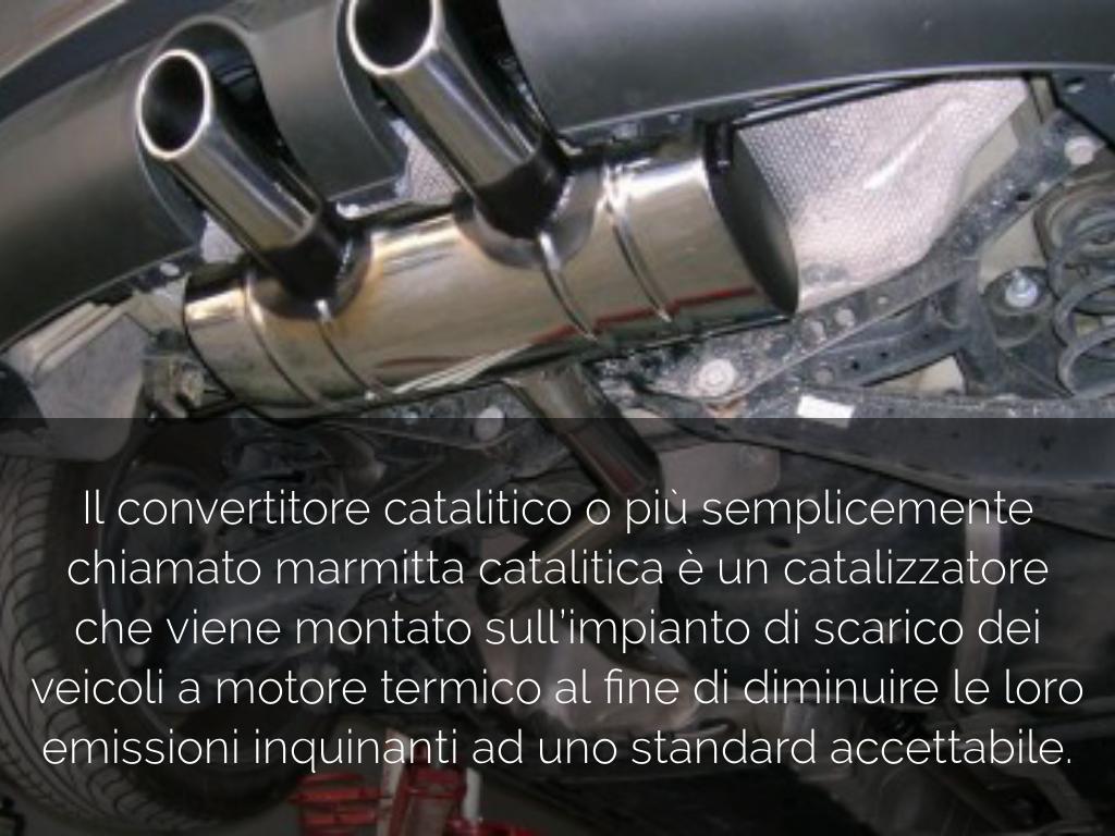 Il convertitore catalitico o più semplicemente chiamato marmitta catalitica è un catalizzatore che viene montato sull’impianto di scarico dei veicoli a motore termico al fine di diminuire le loro emissioni inquinanti ad uno standard accettabile.