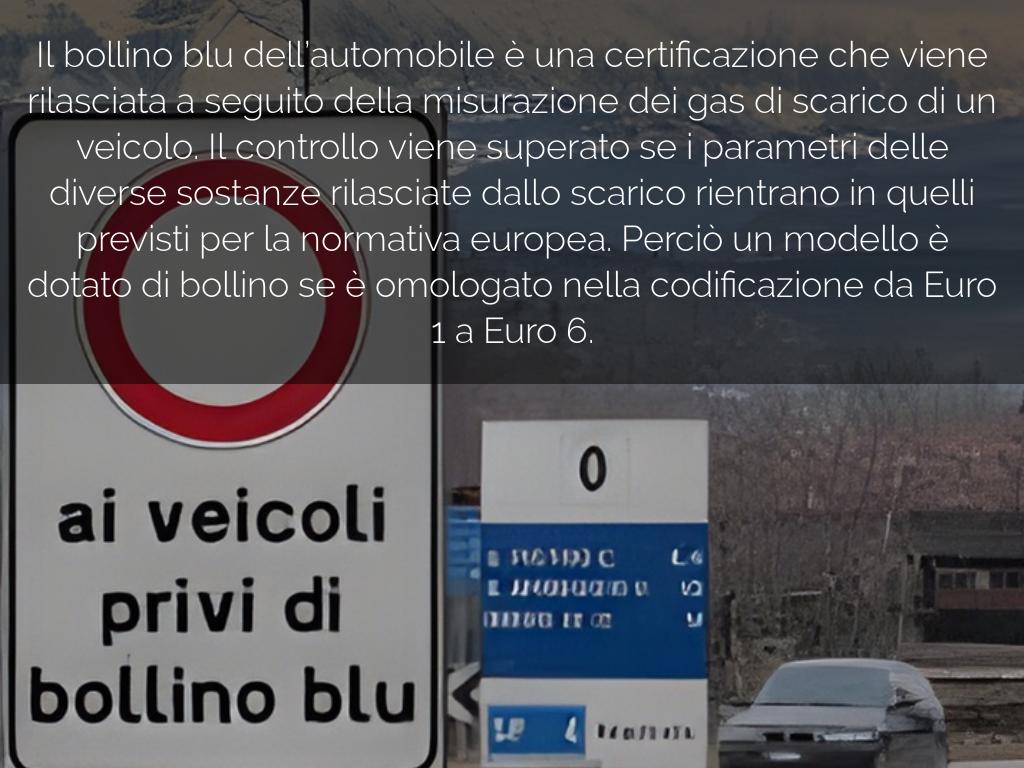Il bollino blu dell’automobile è una certificazione che viene rilasciata a seguito della misurazione dei gas di scarico di un veicolo. Il controllo viene superato se i parametri delle diverse sostanze rilasciate dallo scarico rientrano in quelli previsti per la normativa europea. Perciò un modello è dotato di bollino se è omologato nella codificazione da Euro 1 a Euro 6.