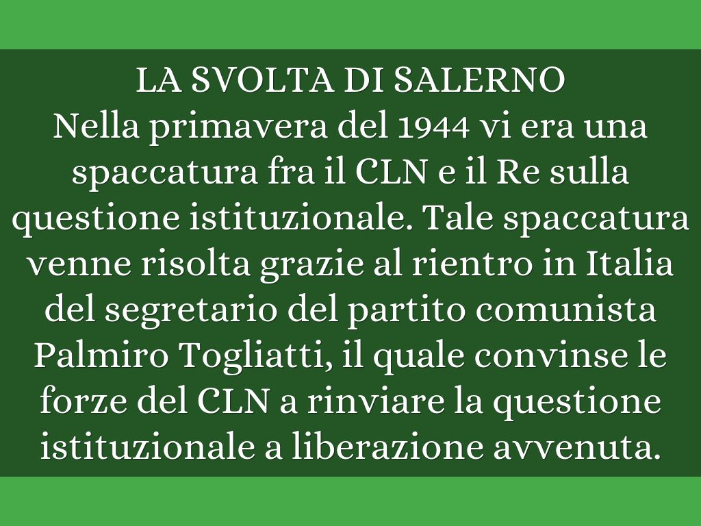 Nella primavera del 1944 vi era una spaccatura fra il CLN e il Re sulla questione istituzionale. Tale spaccatura venne risolta grazie al rientro in Italia del segretario del partito comunista Palmiro Togliatti, il quale convinse le forze del CLN a rinviare la questione istituzionale a liberazione avvenuta.