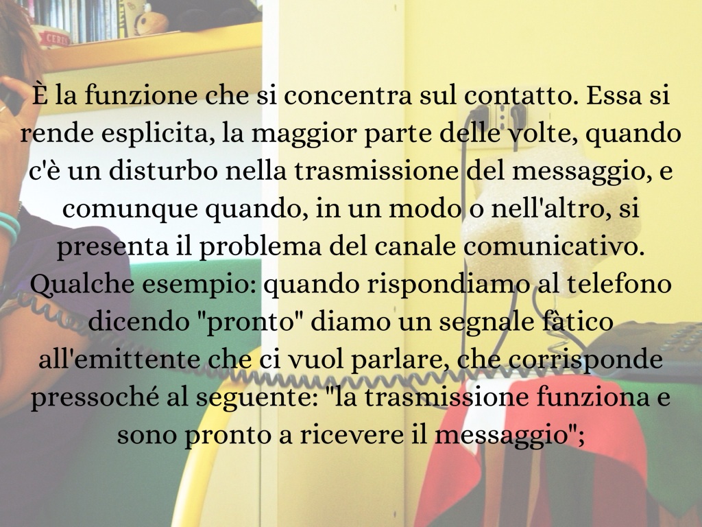 È la funzione che si concentra sul contatto. Essa si rende esplicita, la maggior parte delle volte, quando c'è un disturbo nella trasmissione del messaggio, e comunque quando, in un modo o nell'altro, si presenta il problema del canale comunicativo. Qualche esempio: quando rispondiamo al telefono dicendo "pronto" diamo un segnale fàtico all'emittente che ci vuol parlare, che corrisponde pressoché al seguente: "la trasmissione funziona e sono pronto a ricevere il messaggio";