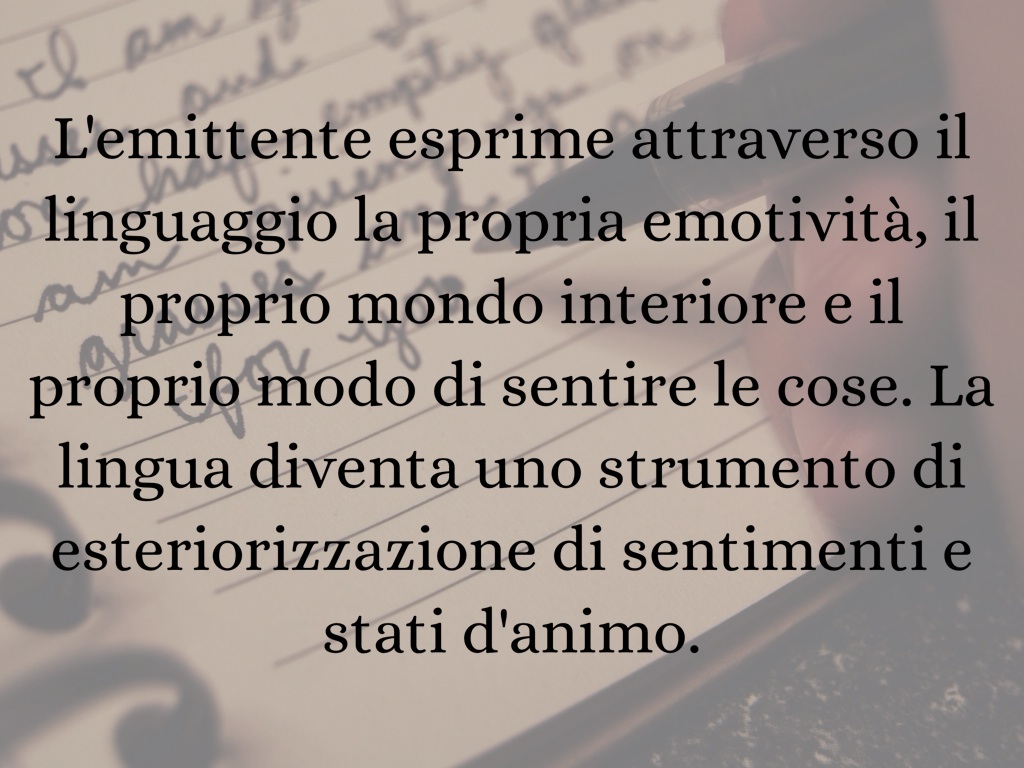 L'emittente esprime attraverso il linguaggio la propria emotività, il proprio mondo interiore e il proprio modo di sentire le cose. La lingua diventa uno strumento di esteriorizzazione di sentimenti e stati d'animo.