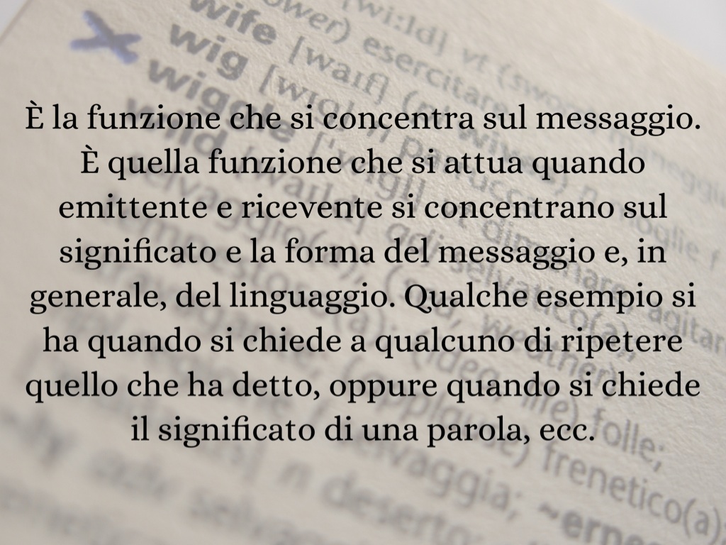 È la funzione che si concentra sul messaggio. È quella funzione che si attua quando emittente e ricevente si concentrano sul significato e la forma del messaggio e, in generale, del linguaggio. Qualche esempio si ha quando si chiede a qualcuno di ripetere quello che ha detto, oppure quando si chiede il significato di una parola, ecc.