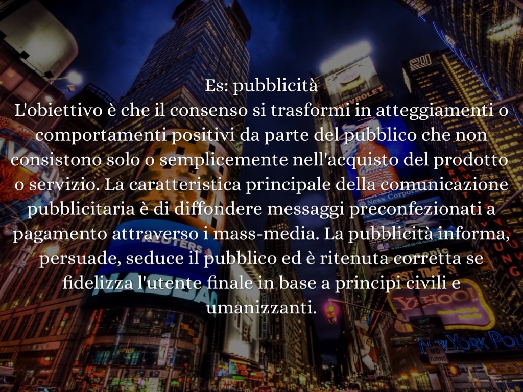 Es: pubblicità L'obiettivo è che il consenso si trasformi in atteggiamenti o comportamenti positivi da parte del pubblico che non consistono solo o semplicemente nell'acquisto del prodotto o servizio. La caratteristica principale della comunicazione pubblicitaria è di diffondere messaggi preconfezionati a pagamento attraverso i mass-media. La pubblicità informa, persuade, seduce il pubblico ed è ritenuta corretta se fidelizza l'utente finale in base a principi civili e umanizzanti.