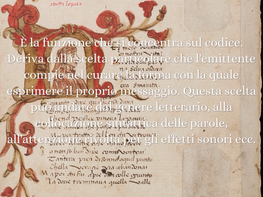 È la funzione che si concentra sul codice. Deriva dalla scelta particolare che l'emittente compie nel curare la forma con la quale esprimere il proprio messaggio. Questa scelta può andare dal genere letterario, alla collocazione sintattica delle parole, all'attenzione rivolta per gli effetti sonori ecc.