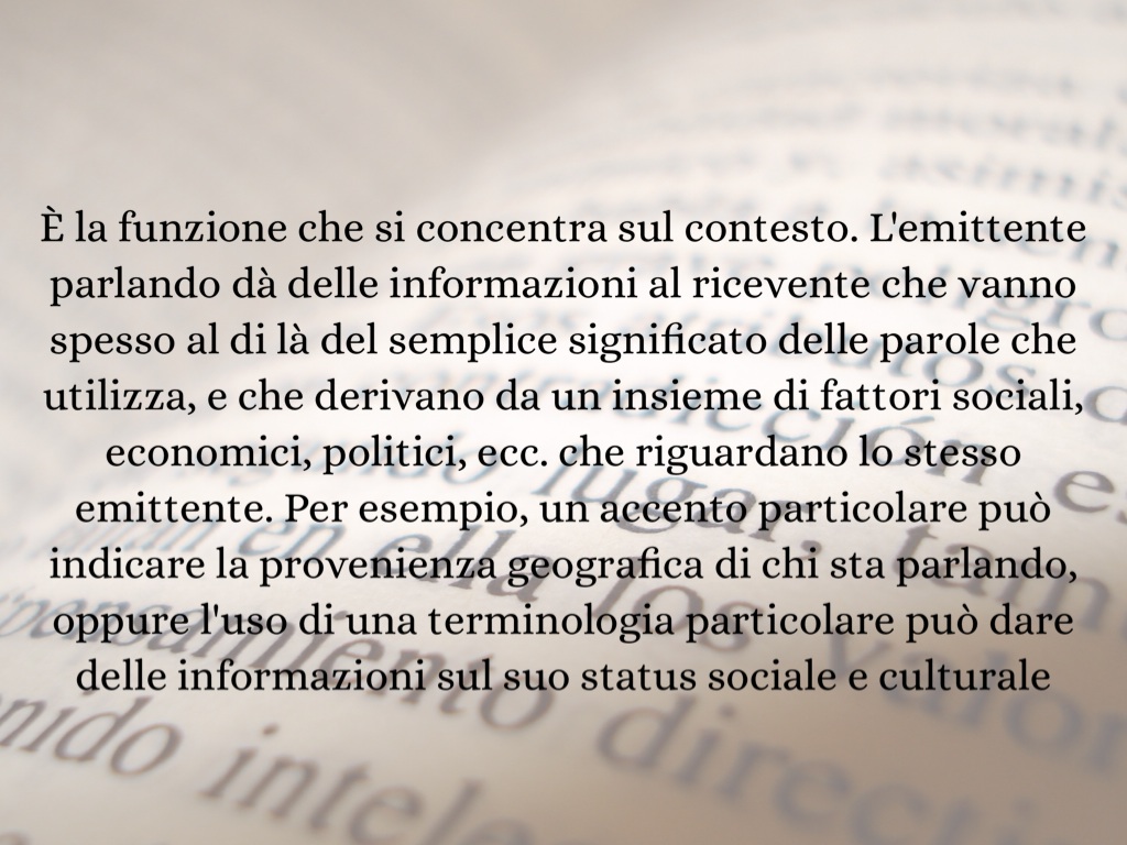 È la funzione che si concentra sul contesto. L'emittente parlando dà delle informazioni al ricevente che vanno spesso al di là del semplice significato delle parole che utilizza, e che derivano da un insieme di fattori sociali, economici, politici, ecc. che riguardano lo stesso emittente. Per esempio, un accento particolare può indicare la provenienza geografica di chi sta parlando, oppure l'uso di una terminologia particolare può dare delle informazioni sul suo status sociale e culturale