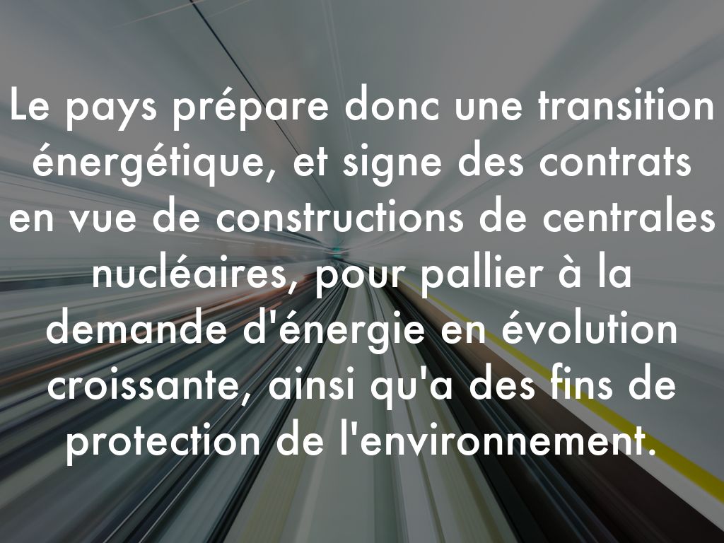 Le pays prépare donc une transition énergétique, et signe des contrats en vue de constructions de centrales nucléaires, pour pallier à la demande d'énergie en évolution croissante, ainsi qu'a des fins de protection de l'environnement.