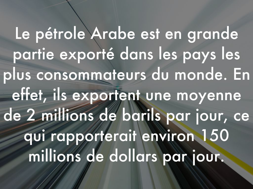 Le pétrole Arabe est en grande partie exporté dans les pays les plus consommateurs du monde. En effet, ils exportent une moyenne de 2 millions de barils par jour, ce qui rapporterait environ 150 millions de dollars par jour.
