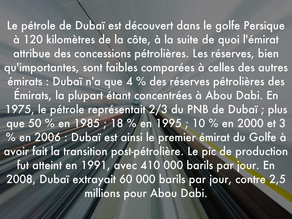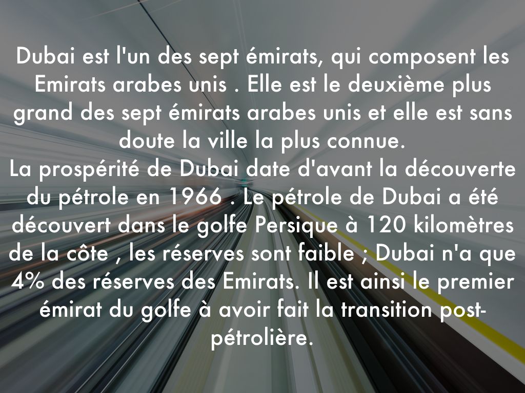Dubai est l'un des sept émirats, qui composent les Emirats arabes unis . Elle est le deuxième plus grand des sept émirats arabes unis et elle est sans doute la ville la plus connue. La prospérité de Dubai date d'avant la découverte du pétrole en 1966 . Le pétrole de Dubai a été découvert dans le golfe Persique à 120 kilomètres de la côte , les réserves sont faible ; Dubai n'a que 4% des réserves des Emirats. Il est ainsi le premier émirat du golfe à avoir fait la transition post-pétrolière.