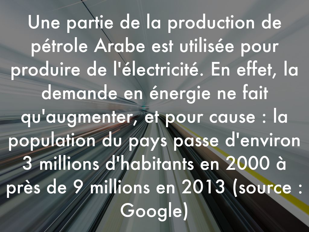 Une partie de la production de pétrole Arabe est utilisée pour produire de l'électricité. En effet, la demande en énergie ne fait qu'augmenter, et pour cause : la population du pays passe d'environ 3 millions d'habitants en 2000 à près de 9 millions en 2013 (source : Google)