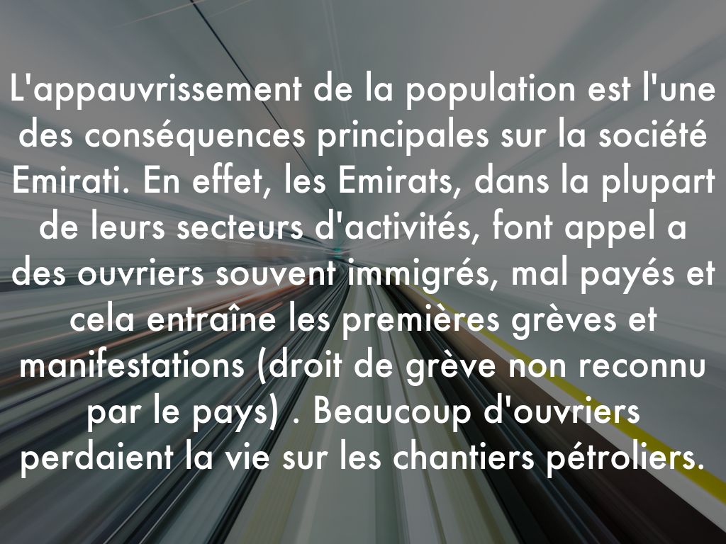 L'appauvrissement de la population est l'une des conséquences principales sur la société Emirati. En effet, les Emirats, dans la plupart de leurs secteurs d'activités, font appel a des ouvriers souvent immigrés, mal payés et cela entraîne les premières grèves et manifestations (droit de grève non reconnu par le pays) . Beaucoup d'ouvriers perdaient la vie sur les chantiers pétroliers.