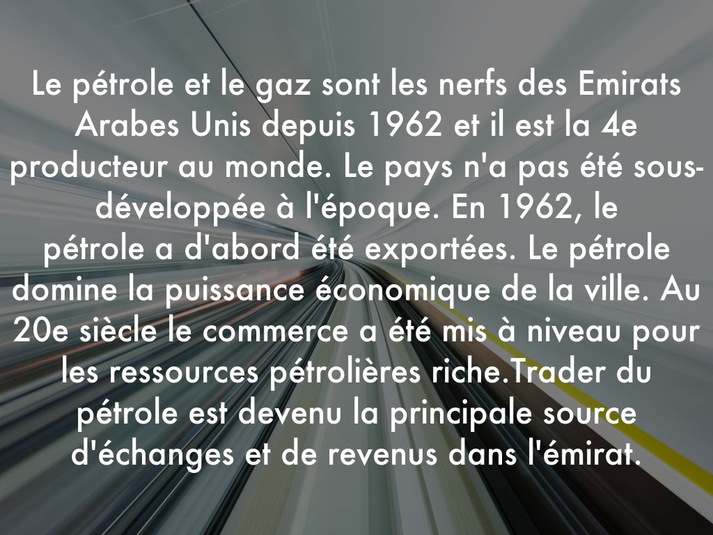 Le pétrole et le gaz sont les nerfs des Emirats Arabes Unis depuis 1962 et il est la 4e producteur au monde. Le pays n'a pas été sous-développée à l'époque. En 1962, le pétrole a d'abord été exportées. Le pétrole domine la puissance économique de la ville. Au 20e siècle le commerce a été mis à niveau pour les ressources pétrolières riche.Trader du pétrole est devenu la principale source d'échanges et de revenus dans l'émirat.
