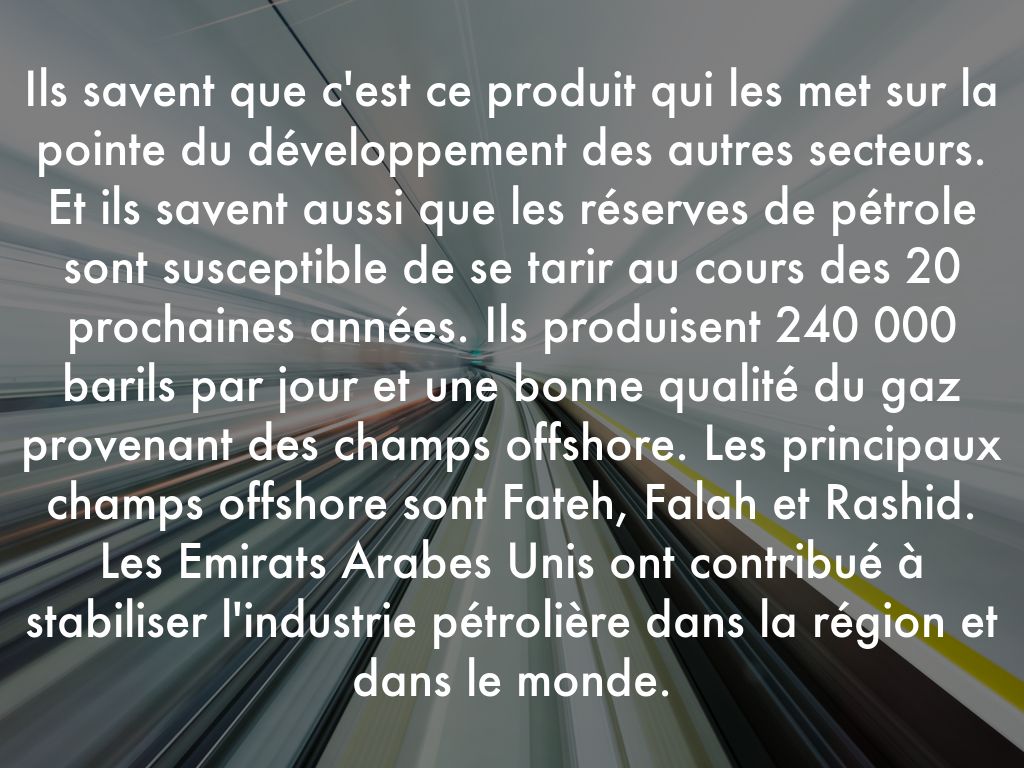 Ils savent que c'est ce produit qui les met sur la pointe du développement des autres secteurs. Et ils savent aussi que les réserves de pétrole sont susceptible de se tarir au cours des 20 prochaines années. Ils produisent 240 000 barils par jour et une bonne qualité du gaz provenant des champs offshore. Les principaux champs offshore sont Fateh, Falah et Rashid. Les Emirats Arabes Unis ont contribué à stabiliser l'industrie pétrolière dans la région et dans le monde.
