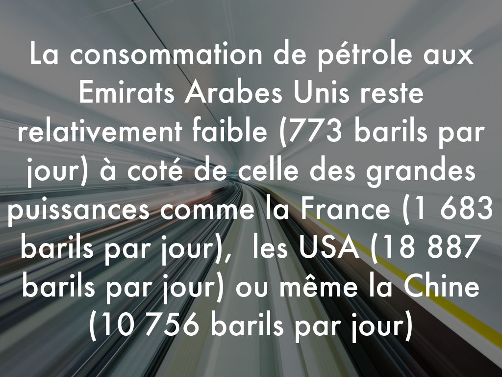 La consommation de pétrole aux Emirats Arabes Unis reste relativement faible (773 barils par jour) à coté de celle des grandes puissances comme la France (1 683 barils par jour), les USA (18 887 barils par jour) ou même la Chine (10 756 barils par jour)