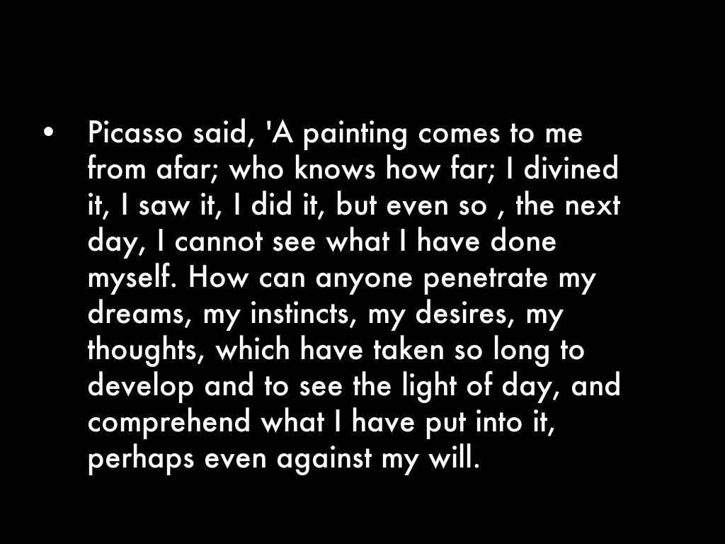 • Picasso said, 'A painting comes to me from afar; who knows how far; I divined it, I saw it, I did it, but even so , the next day, I cannot see what I have done myself. How can anyone penetrate my dreams, my instincts, my desires, my thoughts, which have taken so long to develop and to see the light of day, and comprehend what I have put into it, perhaps even against my will.