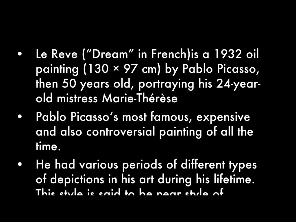 • Le Reve (“Dream” in French)is a 1932 oil painting (130 × 97 cm) by Pablo Picasso, then 50 years old, portraying his 24-year-old mistress Marie-Thérèse