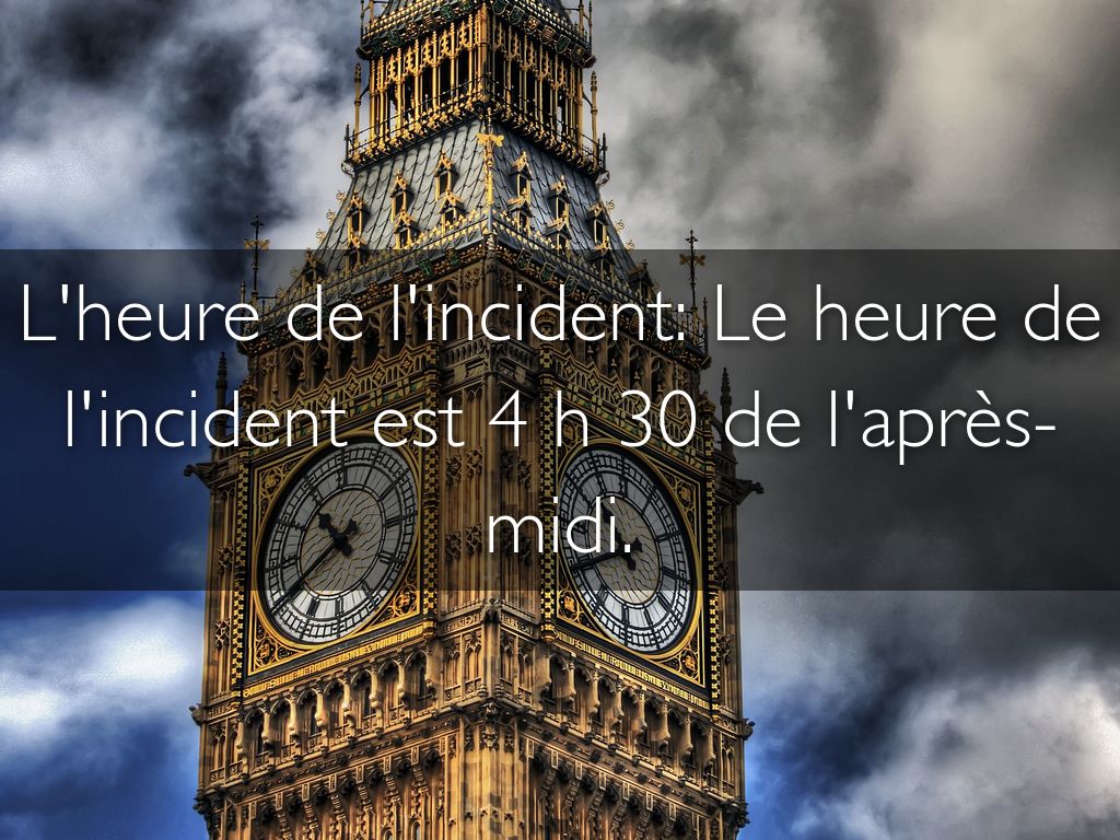 L'heure de l'incident: Le heure de l'incident est 4 h 30 de l'après-midi.