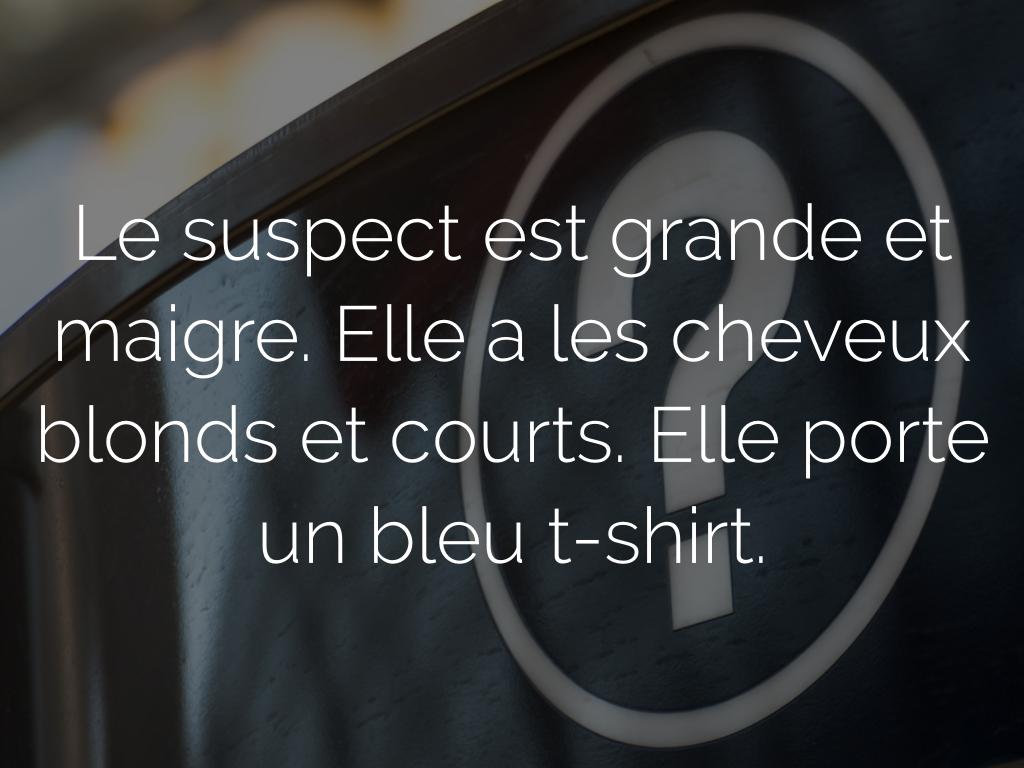 Le suspect est grande et maigre. Elle a les cheveux blonds et courts. Elle porte un bleu t-shirt.