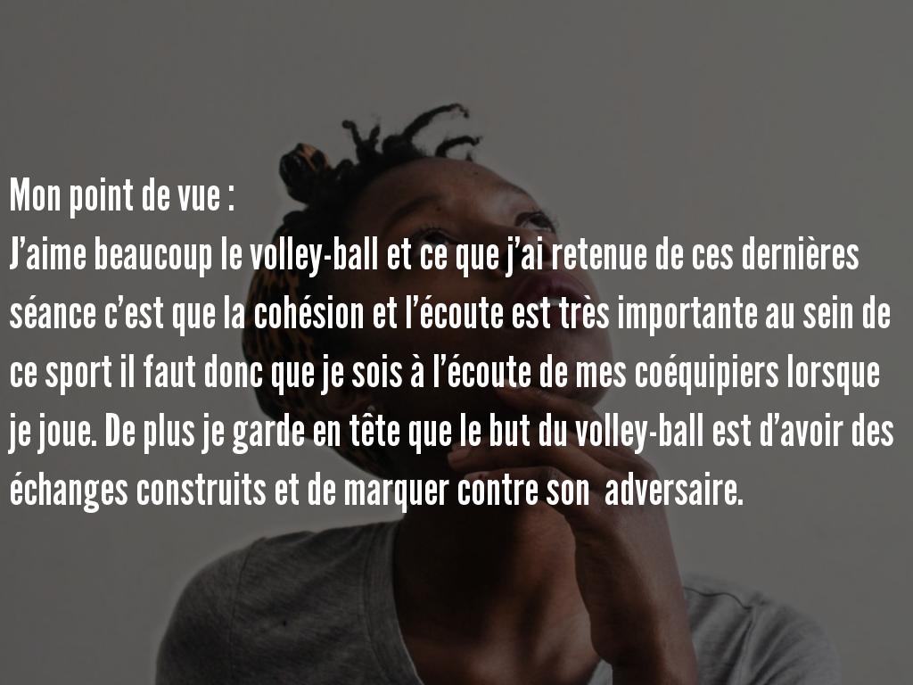 Mon point de vue : J’aime beaucoup le volley-ball et ce que j’ai retenue de ces dernières séance c’est que la cohésion et l’écoute est très importante au sein de ce sport il faut donc que je sois à l’écoute de mes coéquipiers lorsque je joue. De plus je garde en tête que le but du volley-ball est d’avoir des échanges construits et de marquer contre son adversaire.