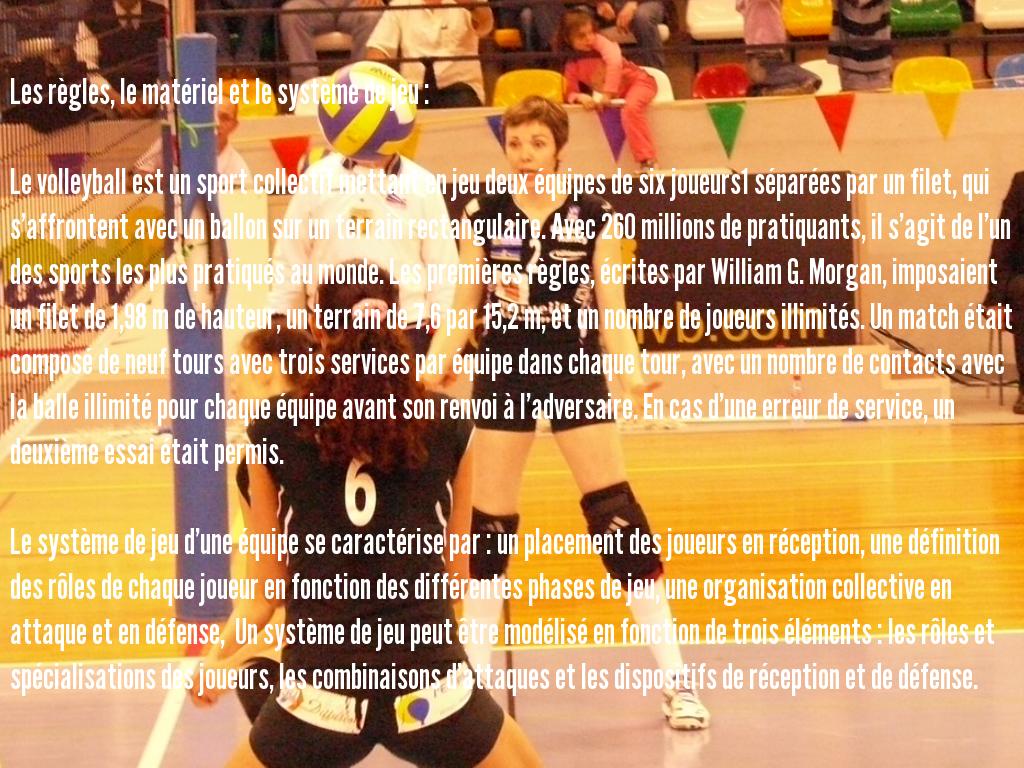 Le volleyball est un sport collectif mettant en jeu deux équipes de six joueurs1 séparées par un filet, qui s'affrontent avec un ballon sur un terrain rectangulaire. Avec 260 millions de pratiquants, il s'agit de l'un des sports les plus pratiqués au monde. Les premières règles, écrites par William G. Morgan, imposaient un filet de 1,98 m de hauteur, un terrain de 7,6 par 15,2 m, et un nombre de joueurs illimités. Un match était composé de neuf tours avec trois services par équipe dans chaque tour, avec un nombre de contacts avec la balle illimité pour chaque équipe avant son renvoi à l'adversaire. En cas d'une erreur de service, un deuxième essai était permis.