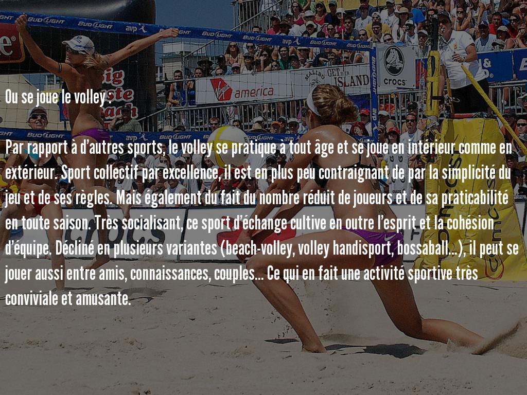 Par rapport à d’autres sports, le volley se pratique à tout âge et se joue en intérieur comme en extérieur. Sport collectif par excellence, il est en plus peu contraignant de par la simplicité du jeu et de ses règles. Mais également du fait du nombre réduit de joueurs et de sa praticabilité en toute saison. Très socialisant, ce sport d’échange cultive en outre l’esprit et la cohésion d’équipe. Décliné en plusieurs variantes (beach-volley, volley handisport, bossaball…), il peut se jouer aussi entre amis, connaissances, couples… Ce qui en fait une activité sportive très conviviale et amusante.
