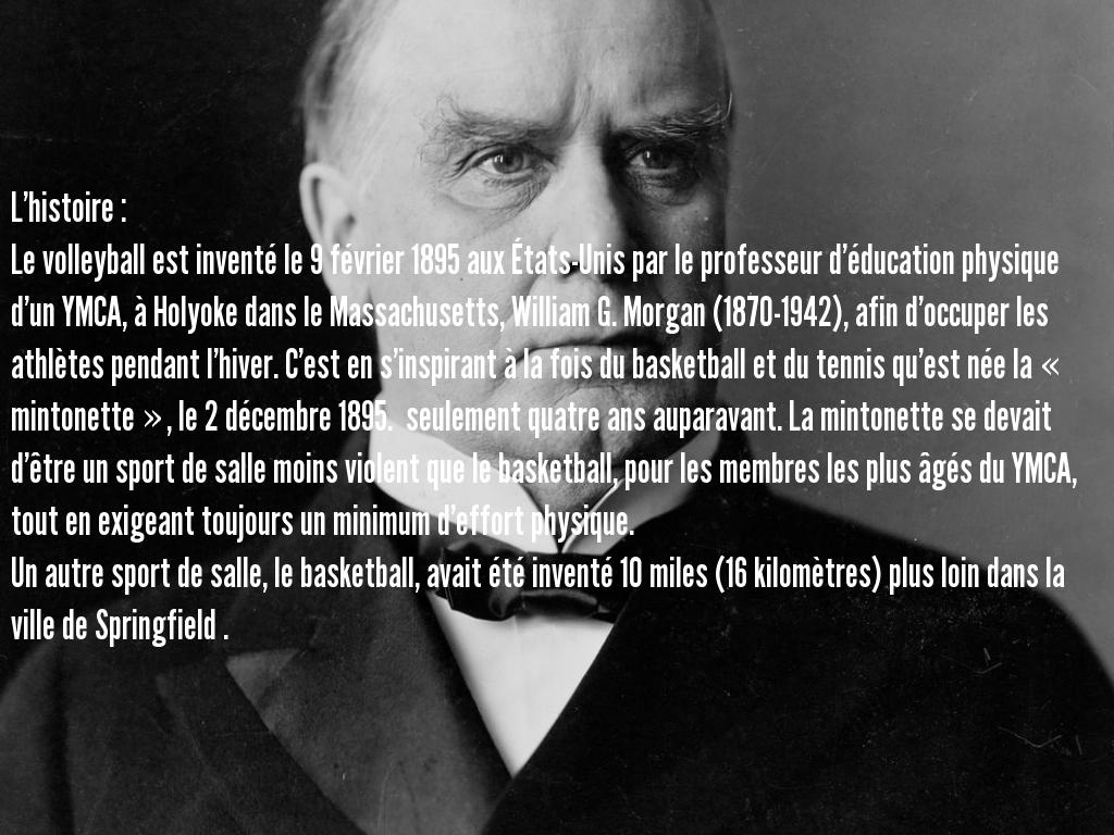 L’histoire : Le volleyball est inventé le 9 février 1895 aux États-Unis par le professeur d’éducation physique d'un YMCA, à Holyoke dans le Massachusetts, William G. Morgan (1870-1942), afin d'occuper les athlètes pendant l'hiver. C'est en s'inspirant à la fois du basketball et du tennis qu'est née la « mintonette », le 2 décembre 1895. seulement quatre ans auparavant. La mintonette se devait d'être un sport de salle moins violent que le basketball, pour les membres les plus âgés du YMCA, tout en exigeant toujours un minimum d'effort physique. Un autre sport de salle, le basketball, avait été inventé 10 miles (16 kilomètres) plus loin dans la ville de Springfield .