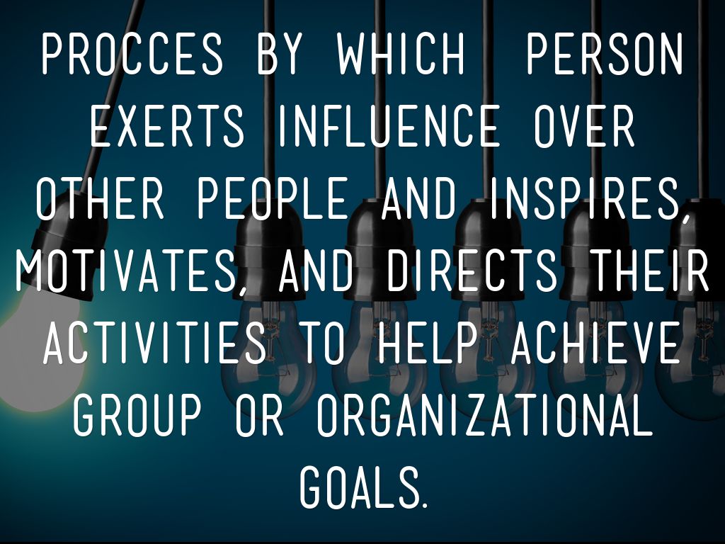 Procces by which person exerts influence over other people and inspires, motivates, and directs their activities to help achieve group or organizational goals.