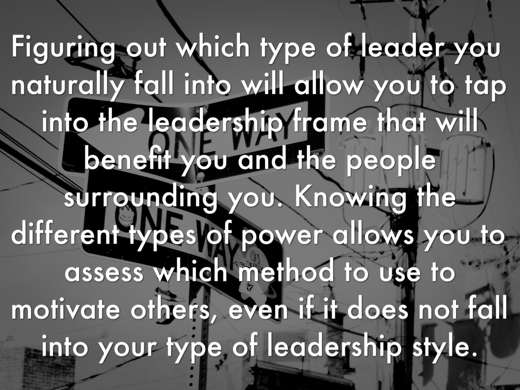 Figuring out which type of leader you naturally fall into will allow you to tap into the leadership frame that will benefit you and the people surrounding you. Knowing the different types of power allows you to assess which method to use to motivate others, even if it does not fall into your type of leadership style.