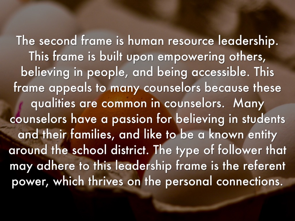The second frame is human resource leadership. This frame is built upon empowering others, believing in people, and being accessible. This frame appeals to many counselors because these qualities are common in counselors. Many counselors have a passion for believing in students and their families, and like to be a known entity around the school district. The type of follower that may adhere to this leadership frame is the referent power, which thrives on the personal connections.