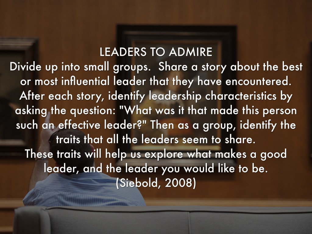 Divide up into small groups. Share a story about the best or most influential leader that they have encountered. After each story, identify leadership characteristics by asking the question: "What was it that made this person such an effective leader?" Then as a group, identify the traits that all the leaders seem to share.