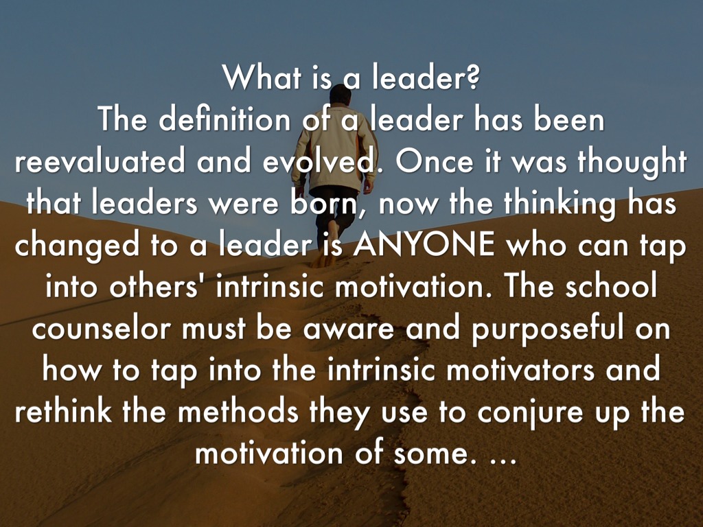 The definition of a leader has been reevaluated and evolved. Once it was thought that leaders were born, now the thinking has changed to a leader is ANYONE who can tap into others' intrinsic motivation. The school counselor must be aware and purposeful on how to tap into the intrinsic motivators and rethink the methods they use to conjure up the motivation of some.