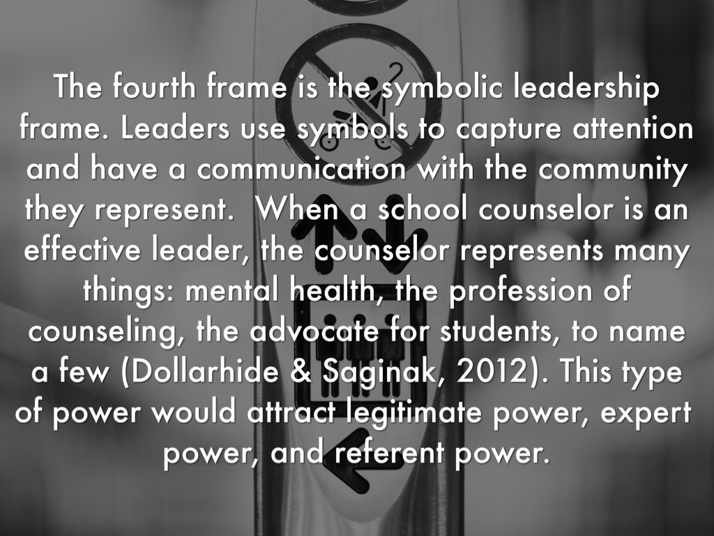The fourth frame is the symbolic leadership frame. Leaders use symbols to capture attention and have a communication with the community they represent. When a school counselor is an effective leader, the counselor represents many things: mental health, the profession of counseling, the advocate for students, to name a few (Dollarhide & Saginak, 2012). This type of power would attract legitimate power, expert power, and referent power.