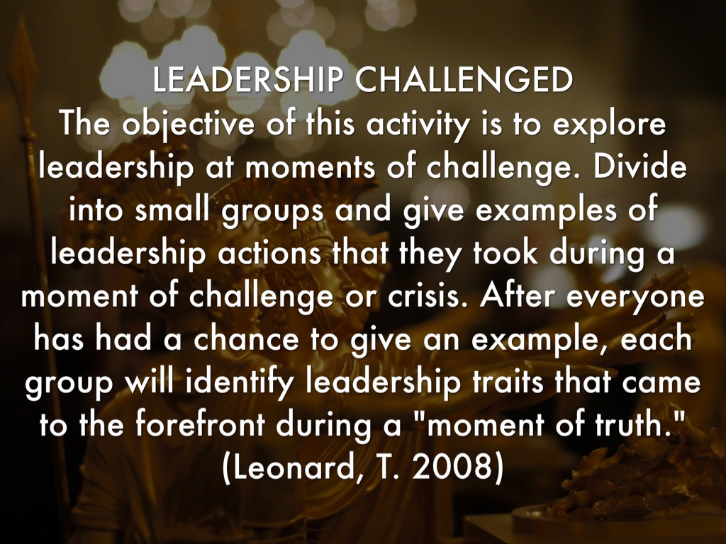 The objective of this activity is to explore leadership at moments of challenge. Divide into small groups and give examples of leadership actions that they took during a moment of challenge or crisis. After everyone has had a chance to give an example, each group will identify leadership traits that came to the forefront during a "moment of truth."