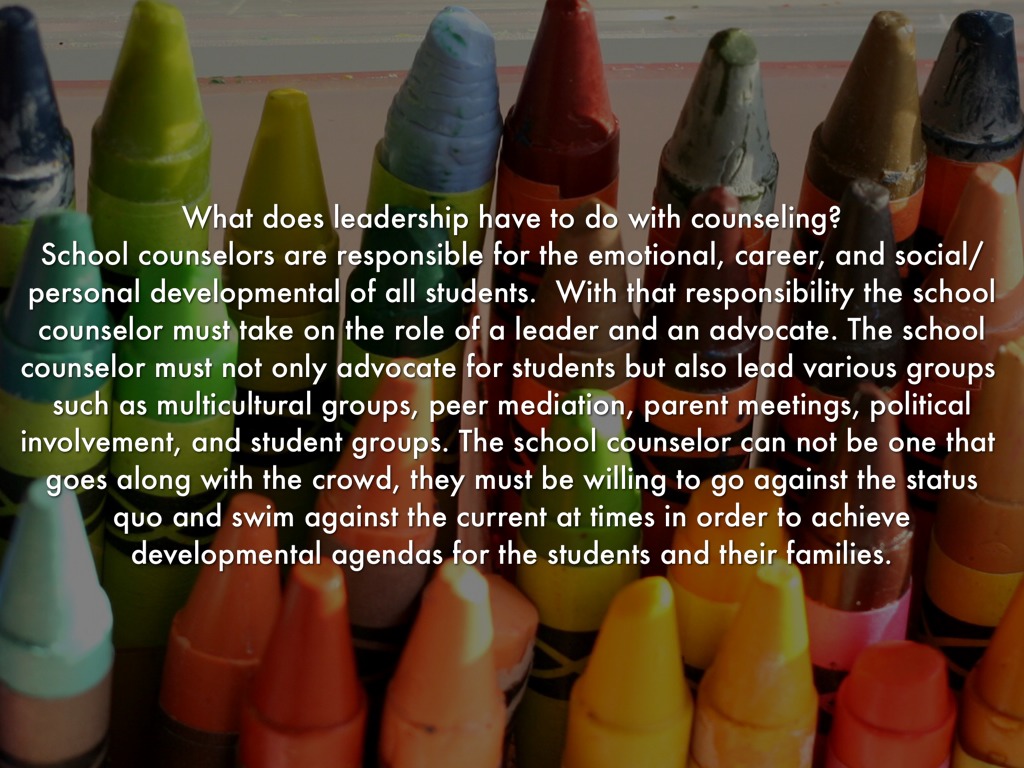 School counselors are responsible for the emotional, career, and social/personal developmental of all students. With that responsibility the school counselor must take on the role of a leader and an advocate. The school counselor must not only advocate for students but also lead various groups such as multicultural groups, peer mediation, parent meetings, political involvement, and student groups. The school counselor can not be one that goes along with the crowd, they must be willing to go against the status quo and swim against the current at times in order to achieve developmental agendas for the students and their families.