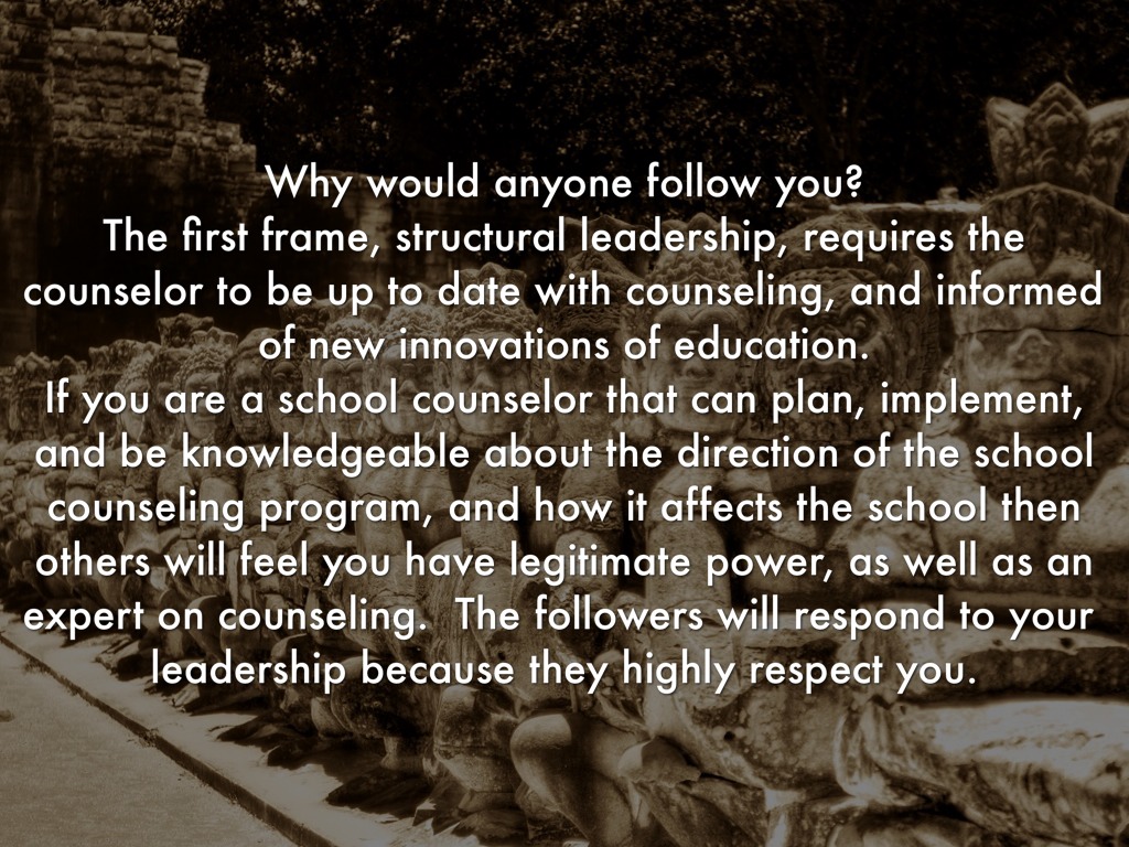 The first frame, structural leadership, requires the counselor to be up to date with counseling, and informed of new innovations of education.