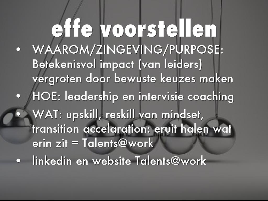 • WAAROM/ZINGEVING/PURPOSE: Betekenisvol impact (van leiders) vergroten door bewuste keuzes maken