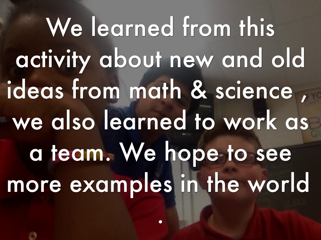We learned from this activity about new and old ideas from math & science , we also learned to work as a team. We hope to see more examples in the world .