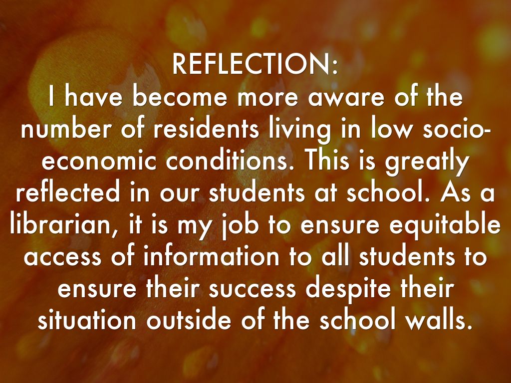 REFLECTION: I have become more aware of the number of residents living in low socio-economic conditions. This is greatly reflected in our students at school. As a librarian, it is my job to ensure equitable access of information to all students to ensure their success despite their situation outside of the school walls.