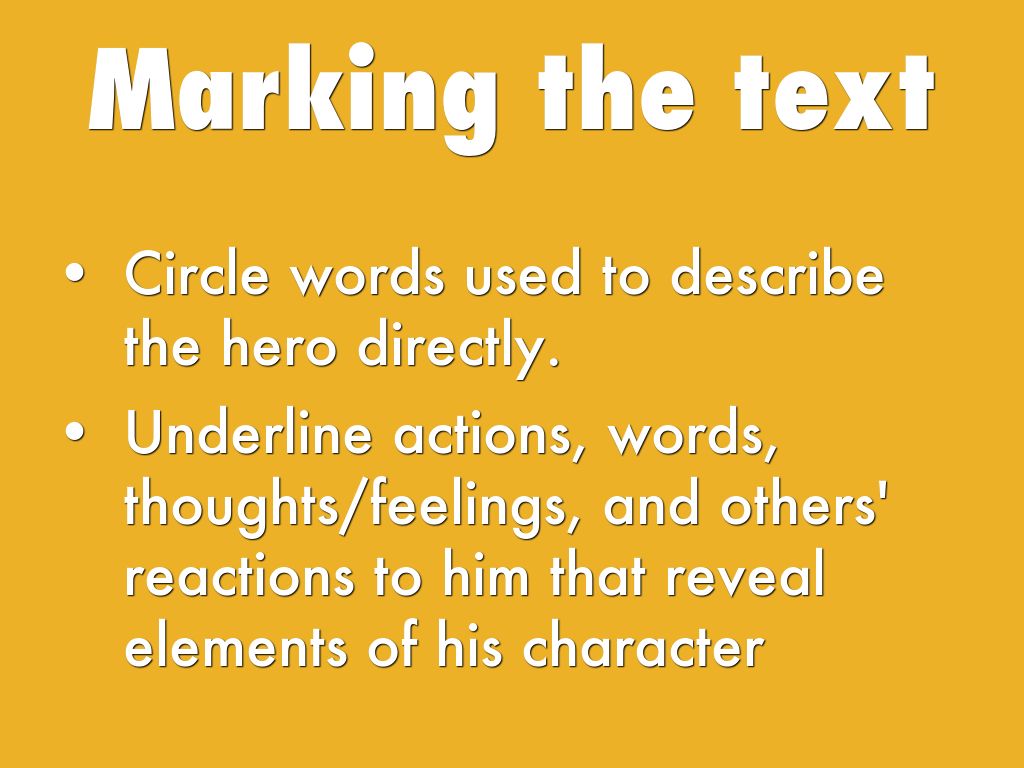 - Underline actions, words, thoughts/feelings, and others' reactions to him that reveal elements of his character