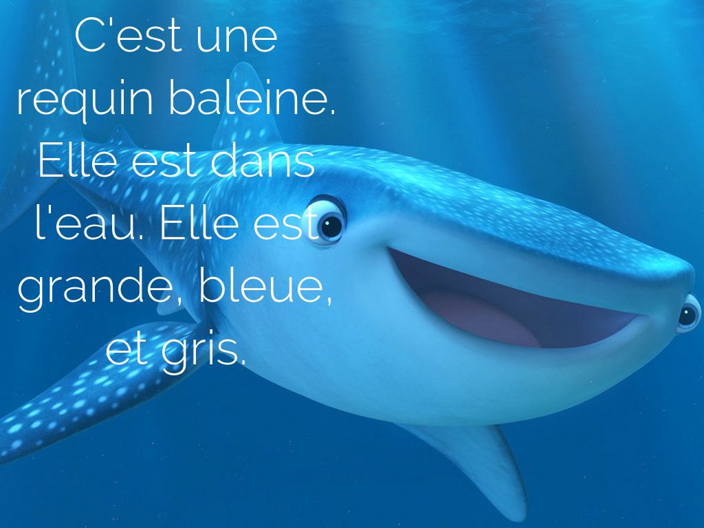C'est une requin baleine. Elle est dans l'eau. Elle est grande, bleue, et gris.