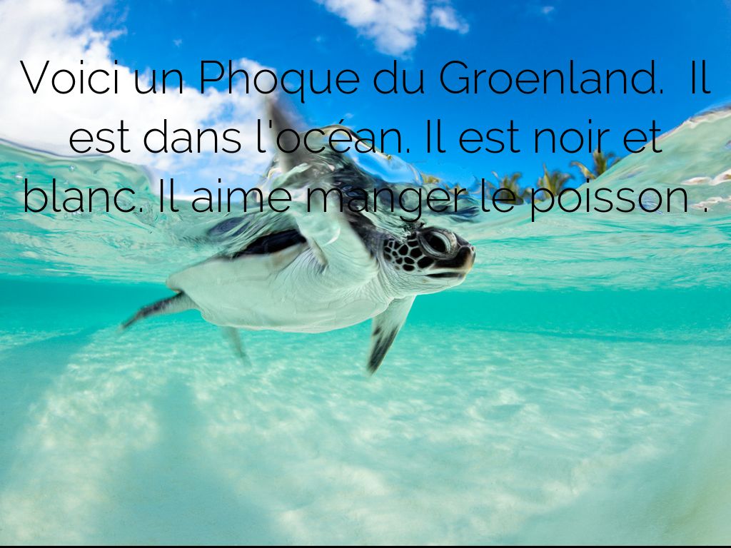 Voici un Phoque du Groenland. Il est dans l'océan. Il est noir et blanc. Il aime manger le poisson .