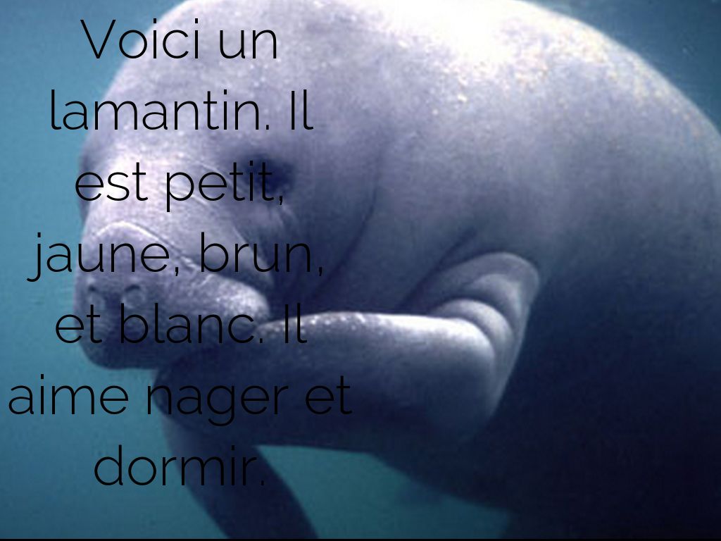 Voici un lamantin. Il est petit, jaune, brun, et blanc. Il aime nager et dormir.