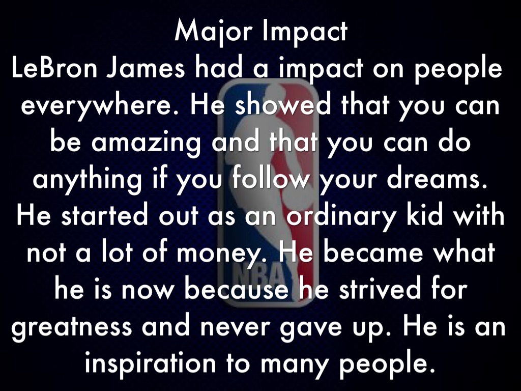 LeBron James had a impact on people everywhere. He showed that you can be amazing and that you can do anything if you follow your dreams. He started out as an ordinary kid with not a lot of money. He became what he is now because he strived for greatness and never gave up. He is an inspiration to many people.