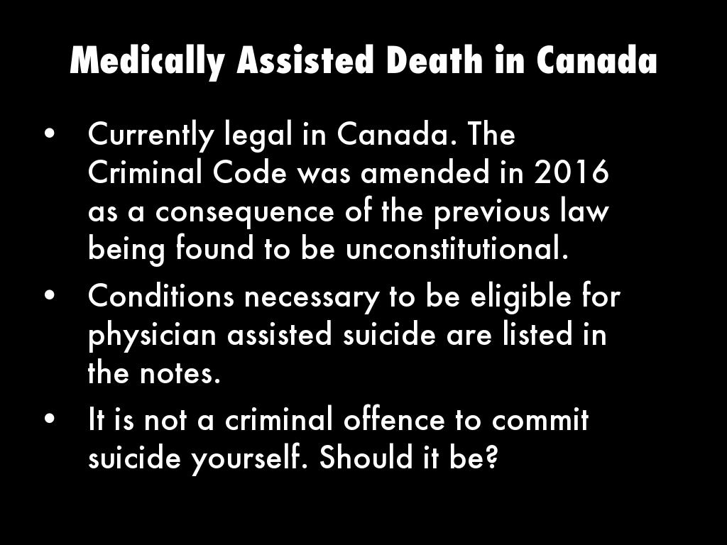 http://www.cbc.ca/news/health/timeline-assisted-suicide-in-canada-1.2946485This link provides you with a current understanding of legislation related to medically assisted death in Canada: