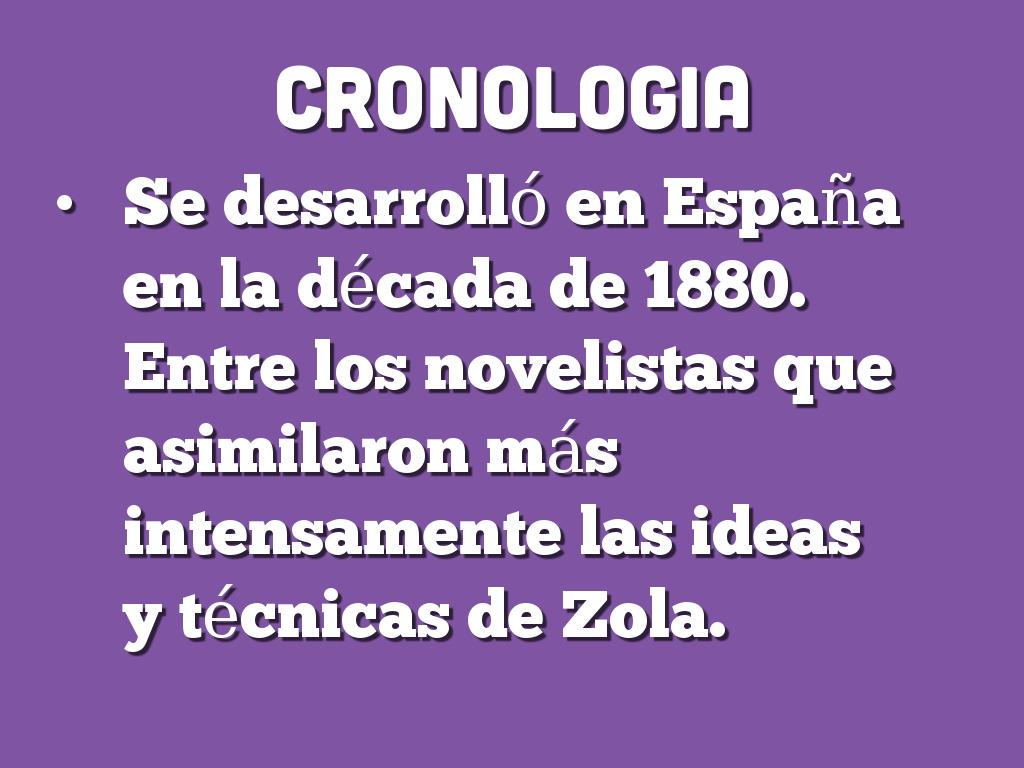 Se desarrolló en España en la década de 1880. Entre los novelistas que asimilaron más intensamente las ideas y técnicas de Zola.