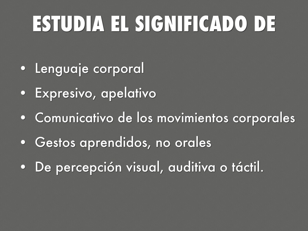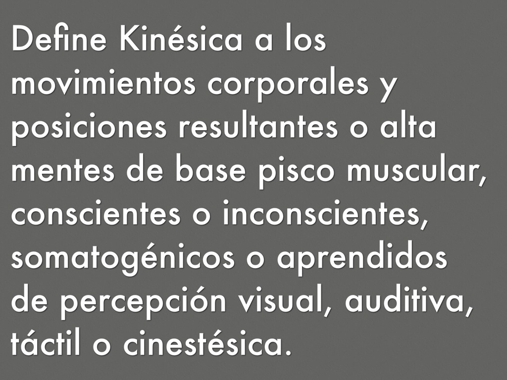 Define Kinésica a los movimientos corporales y posiciones resultantes o alta mentes de base pisco muscular, conscientes o inconscientes, somatogénicos o aprendidos de percepción visual, auditiva, táctil o cinestésica.