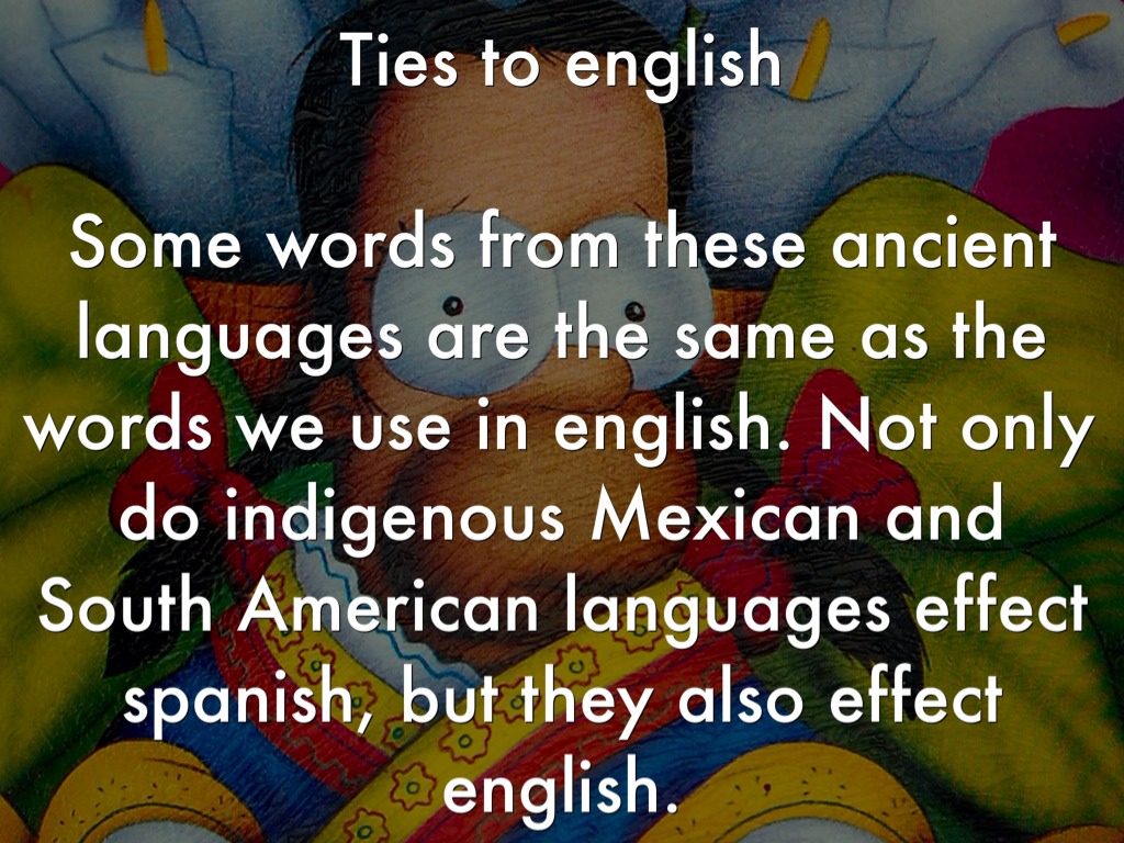 Some words from these ancient languages are the same as the words we use in english. Not only do indigenous Mexican and South American languages effect spanish, but they also effect english.