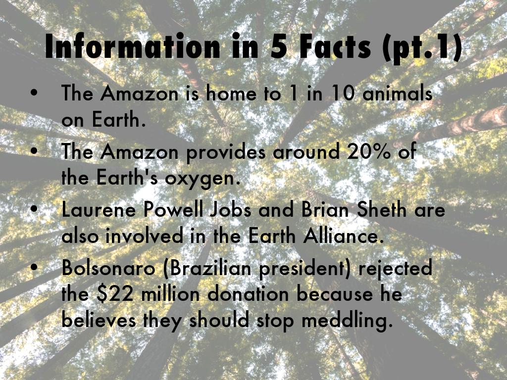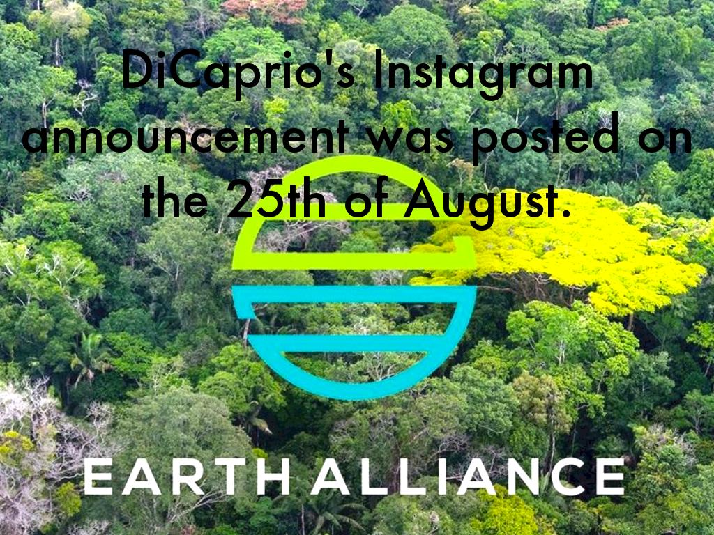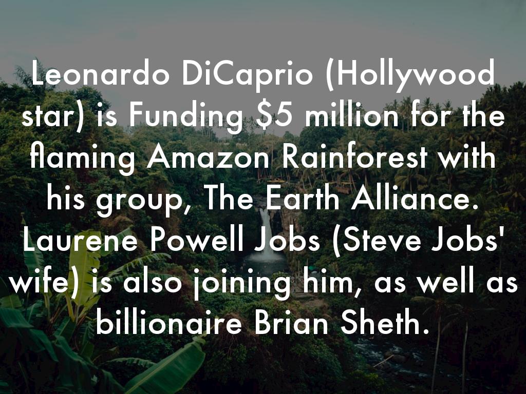 Leonardo DiCaprio (Hollywood star) is Funding $5 million for the flaming Amazon Rainforest with his group, The Earth Alliance. Laurene Powell Jobs (Steve Jobs' wife) is also joining him, as well as billionaire Brian Sheth.